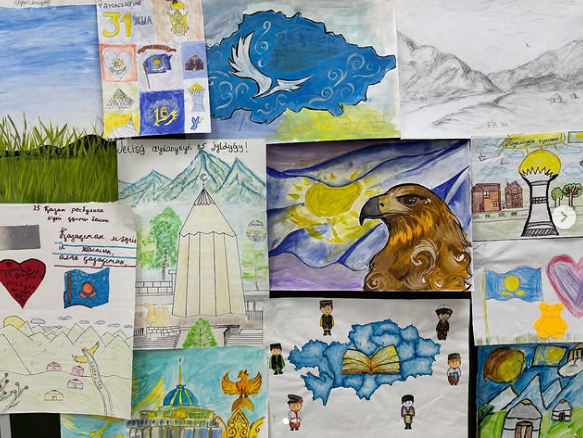 Көрмеге окушылар өз шығармашылық енбектерін ұсынып, ел тауелсіздігі мен құқықтық, мемлекет құндылыктарын бейнелейтін суреттер салды. Жас ұрпактың, шығармашылығы - болашаққа деген сенімнің айғағы.